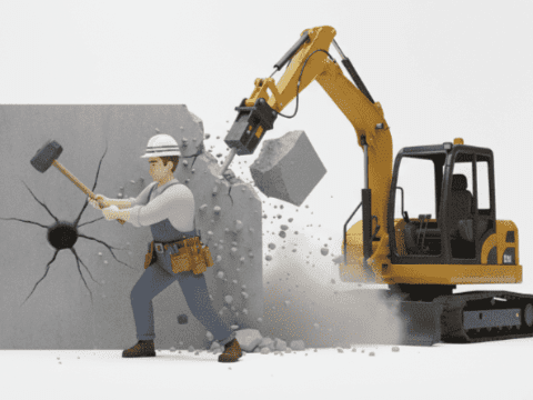 職人さんがコンクリート壁をハンマーで砕いたり、重機で一気に破壊したり。