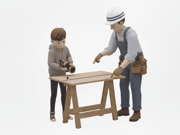 ノコギリ、トンカチ、電動ドリルなど、職人さんの仕事道具を使って型枠作り!